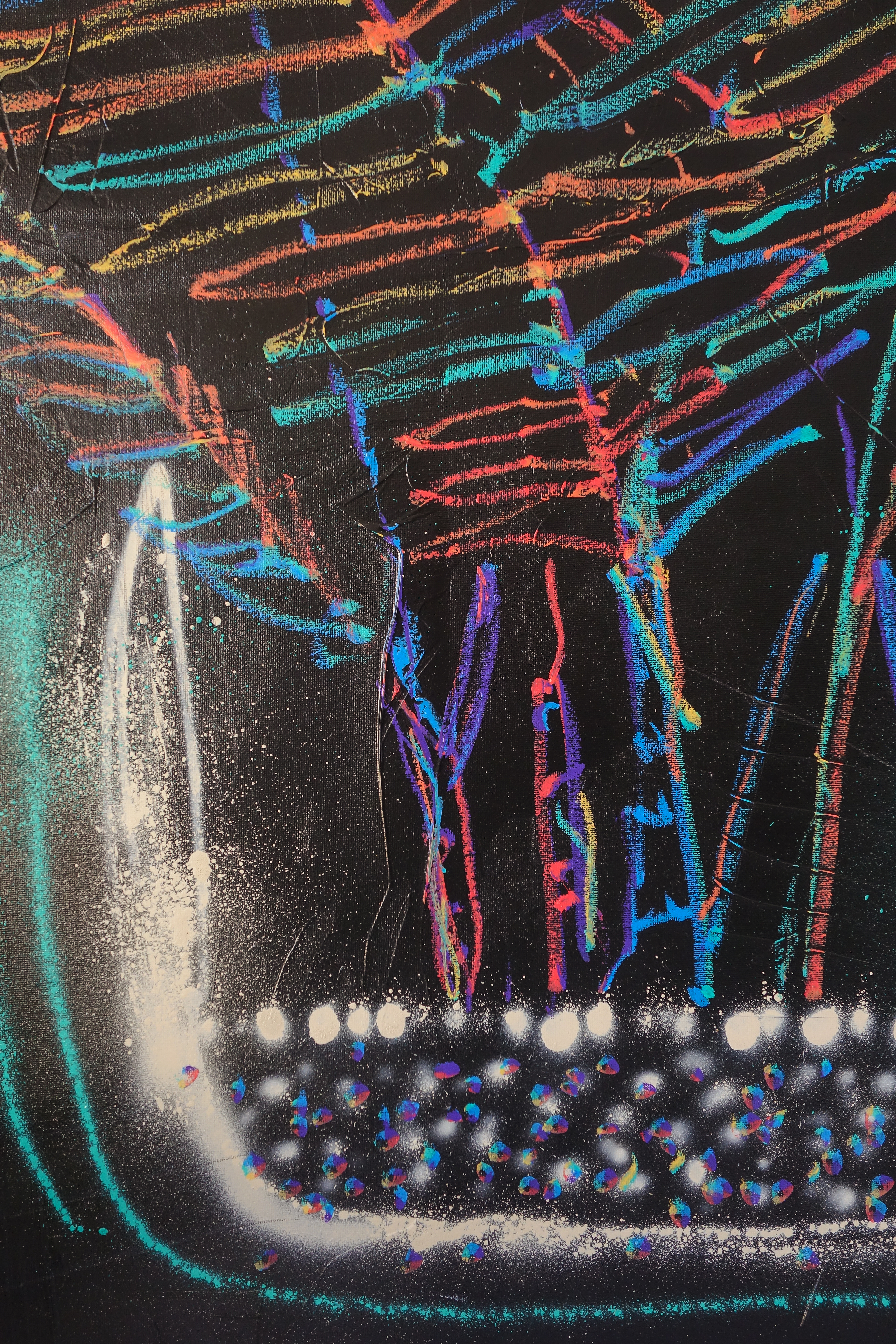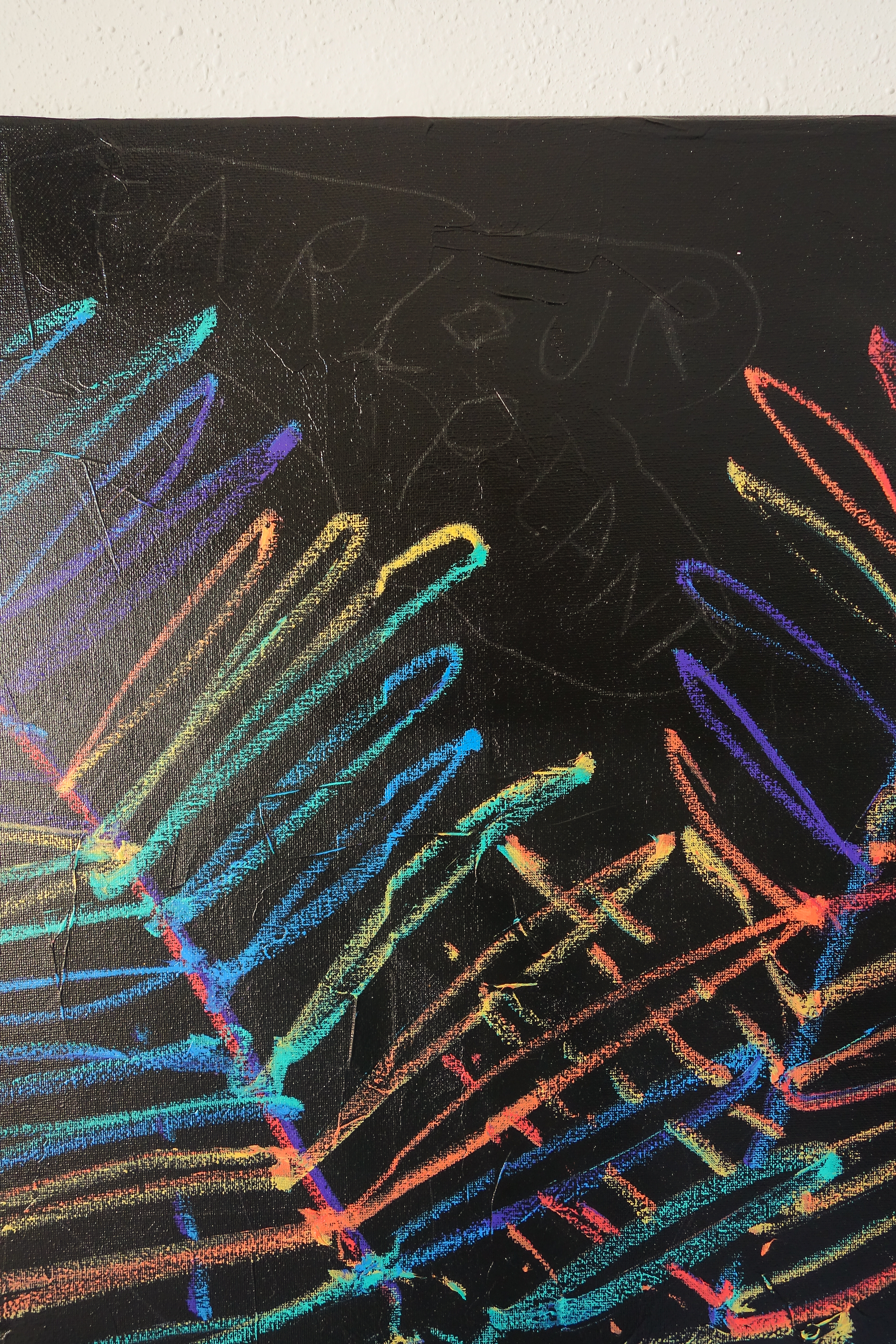 Acryl, Marker, Bleistift, Sprühfarbe und Textil auf Leinwand
