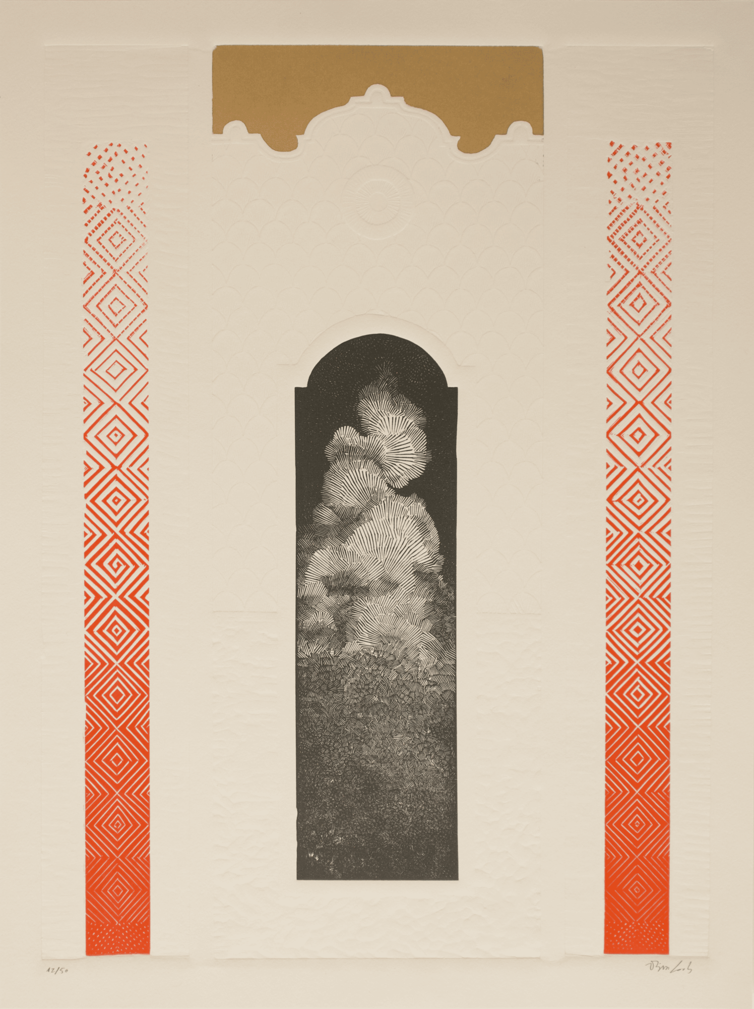 Holzschnitt, gedruckt auf cremefarbenem Papier mit roter, schwarzer und goldener Reliefdruckfarbe.
