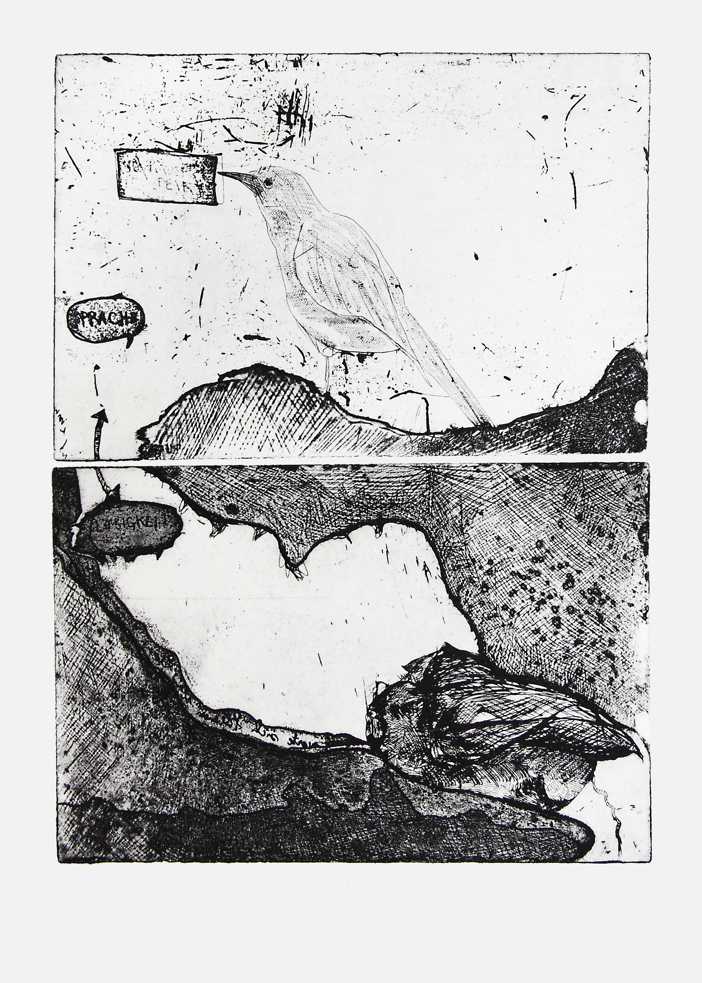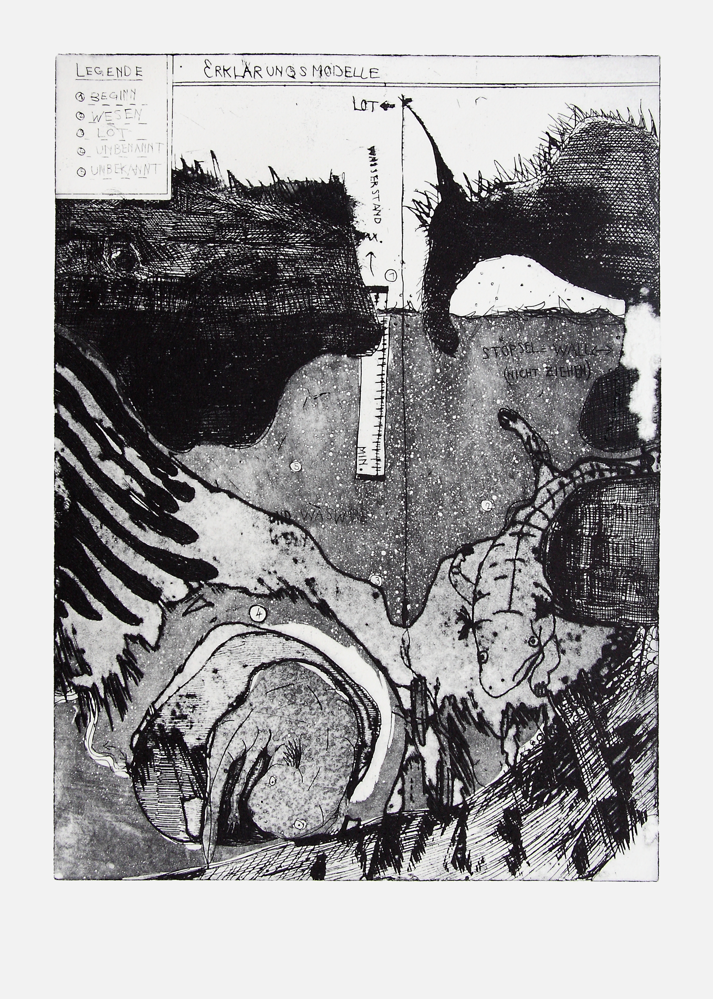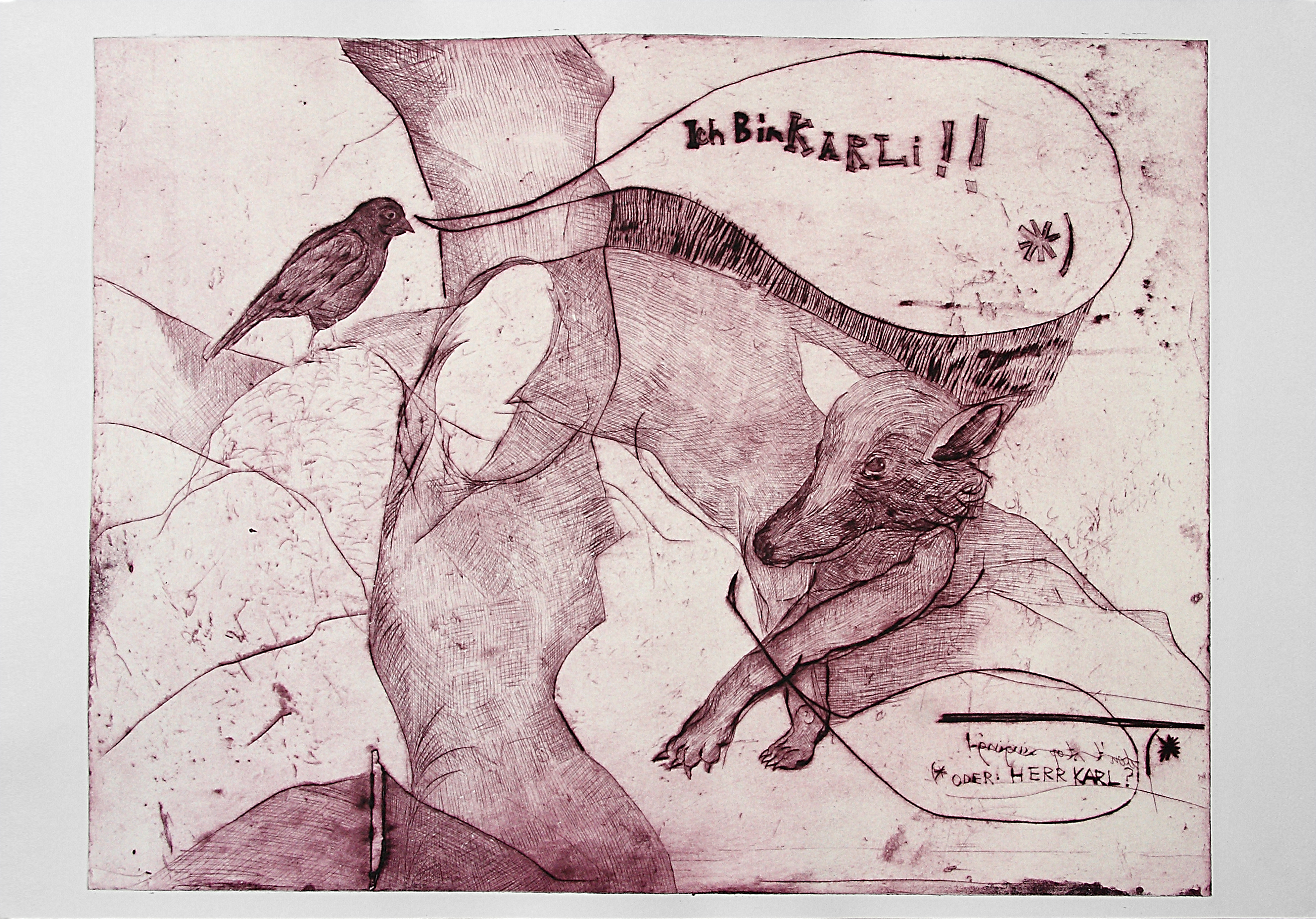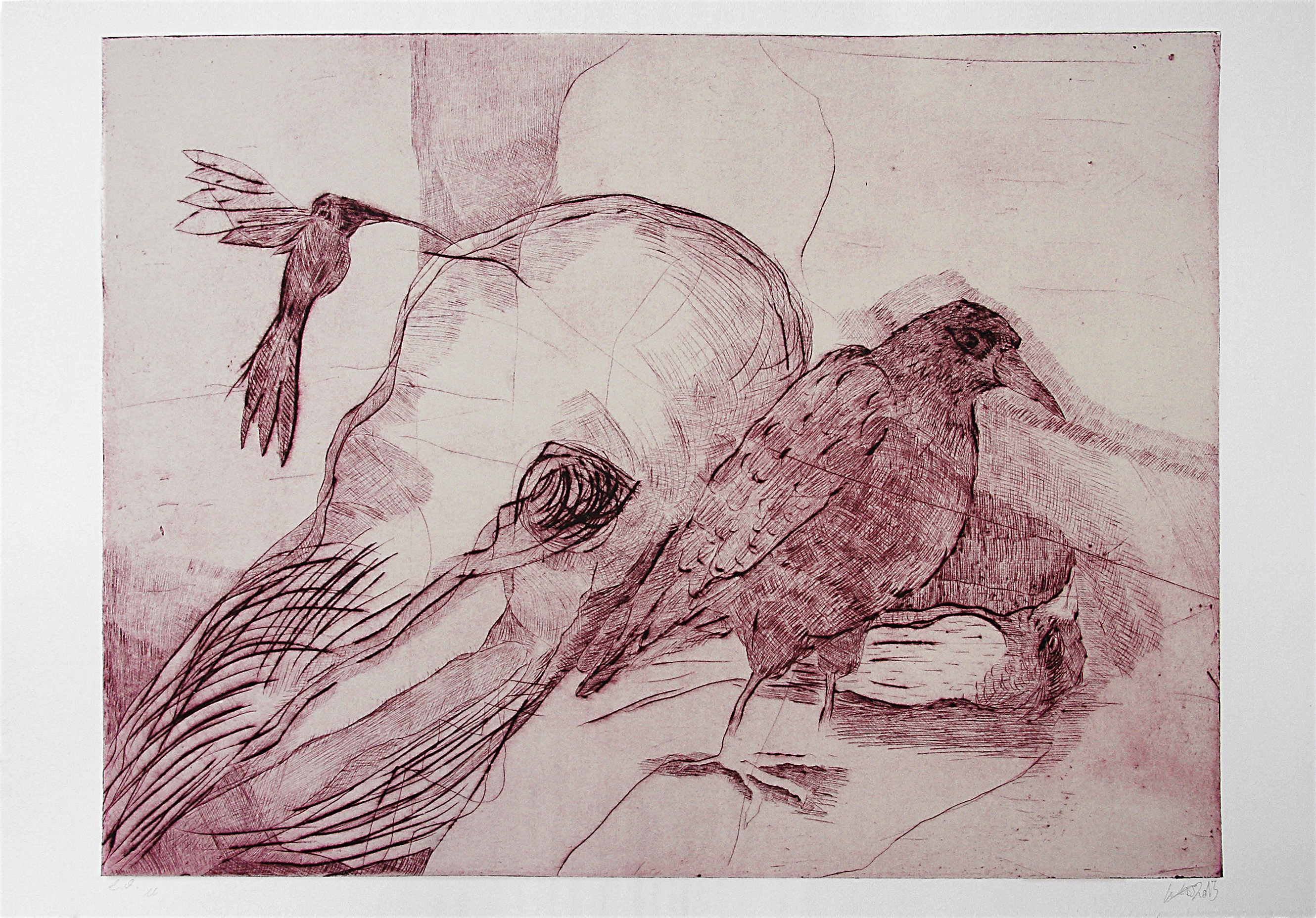 Das Besondere an der Kaltnadelradierung sind die sogenannten Grate: Das Metall, das beim Ritzen verdrängt wird, bleibt stehen und erzeugt feine Materialverschiebungen, die dem Druck später eine weiche, tiefe Anmutung verleihen, wie sie keine andere Technik erzeugt.