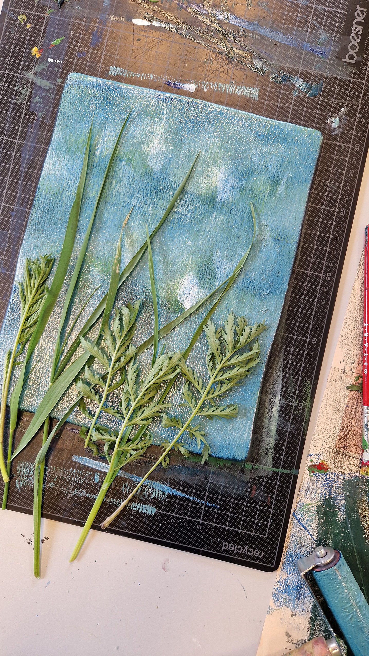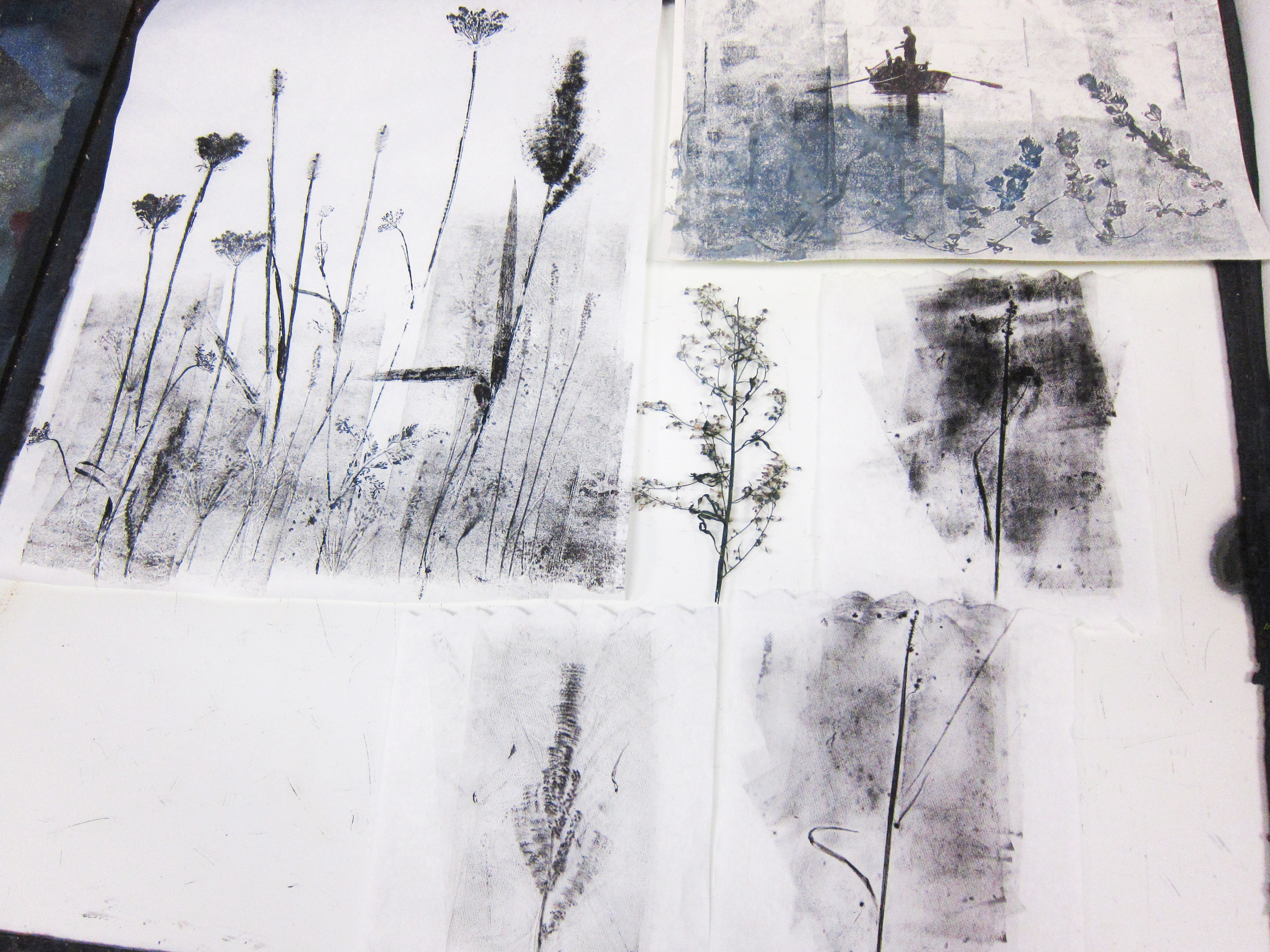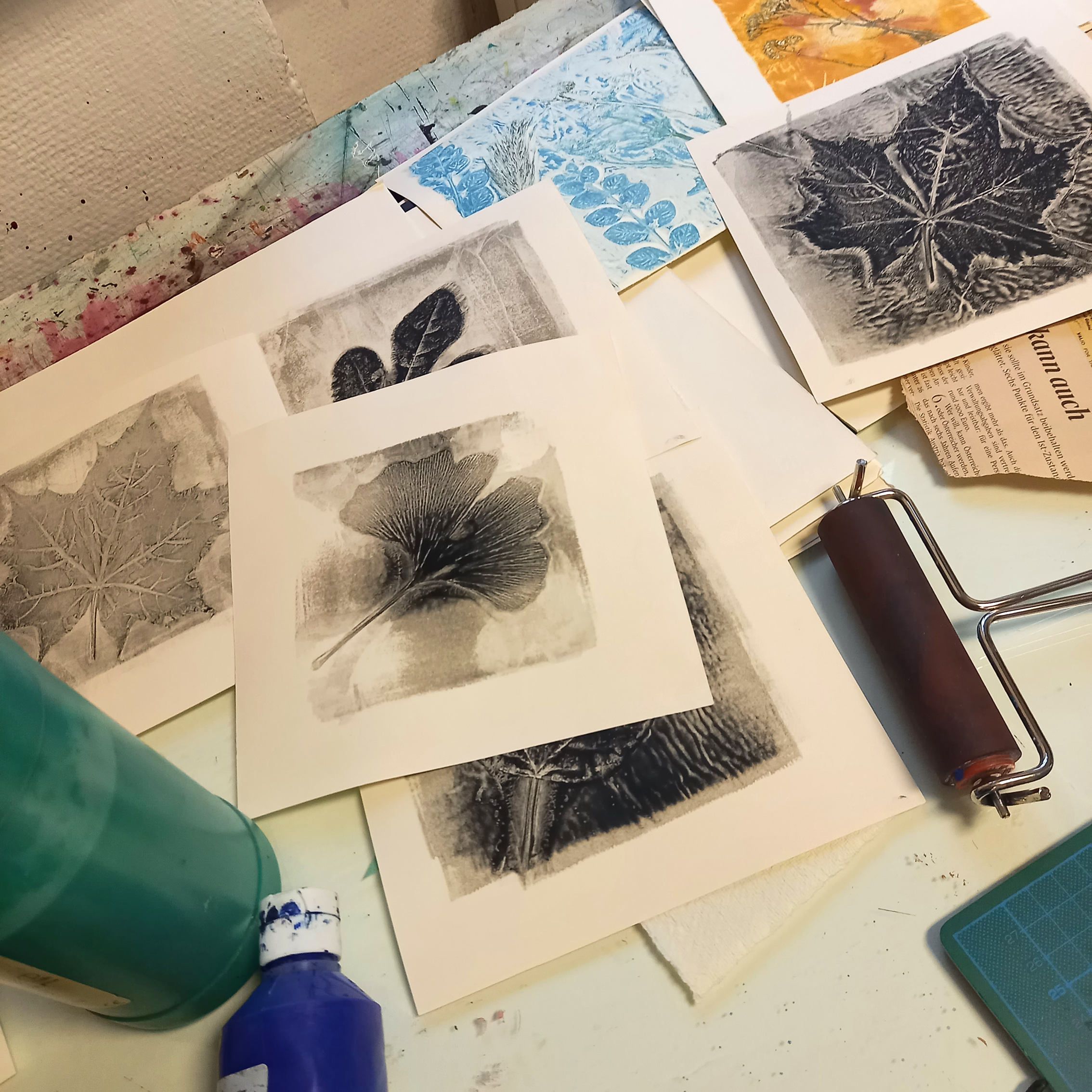 Weiche Gelatineplatten ermöglichen intuitive Monotypien – von jedem Druck entsteht nur ein einziges Exemplar. Wir arbeiten mit Pflanzen, Blüten und verschiedenen Strukturen, die in die Platte gedrückt oder auf ihr arrangiert werden.