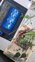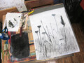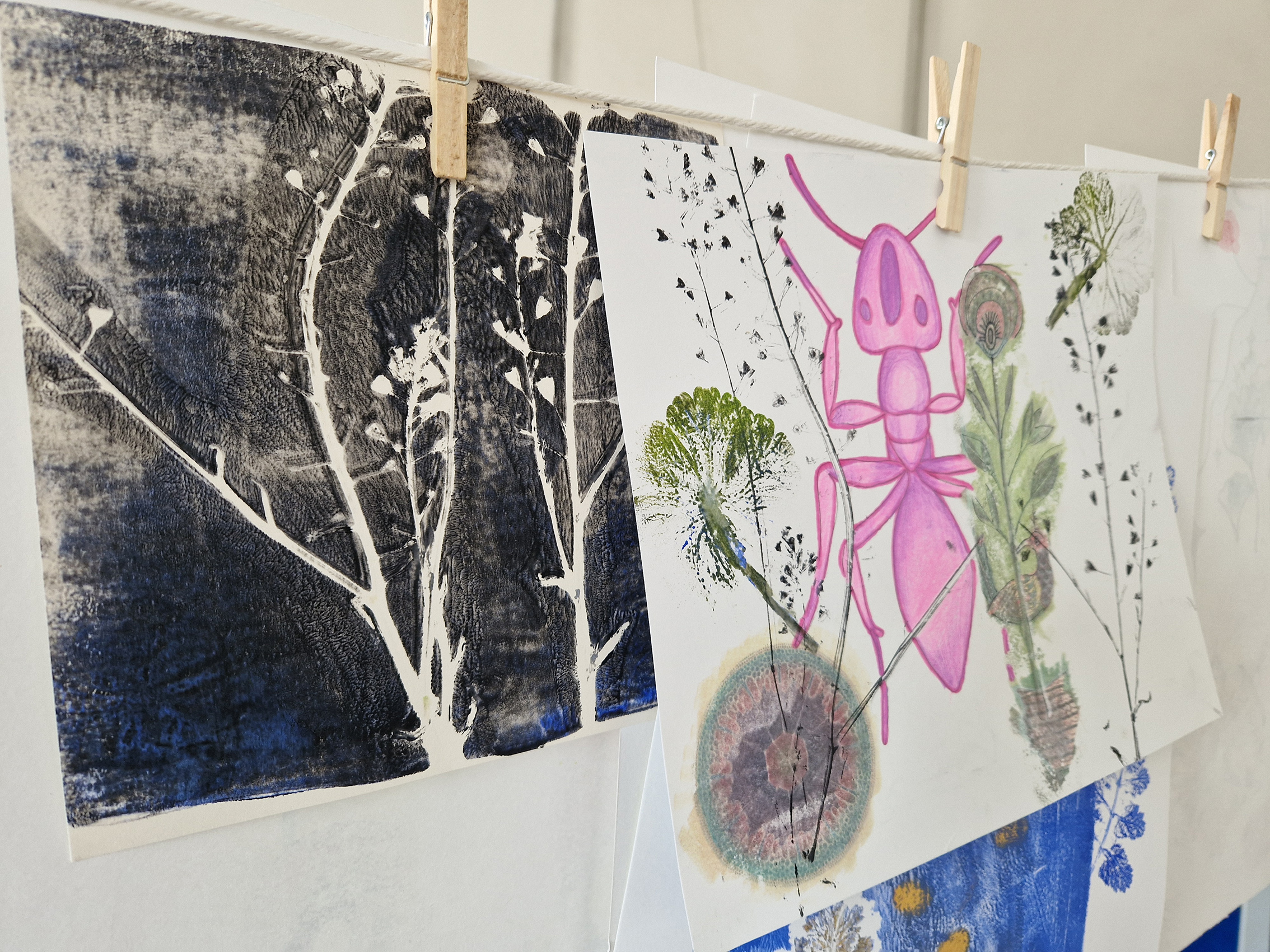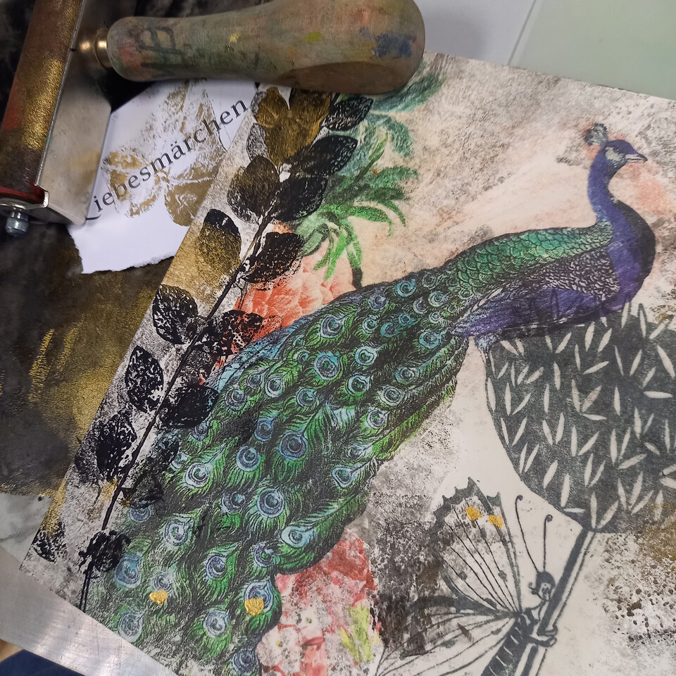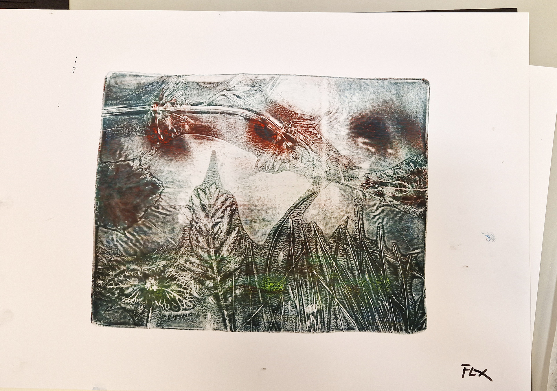 Weiche Gelatineplatten ermöglichen intuitive Monotypien – von jedem Druck entsteht nur ein einziges Exemplar. Wir arbeiten mit Pflanzen, Blüten und verschiedenen Strukturen, die in die Platte gedrückt oder auf ihr arrangiert werden.