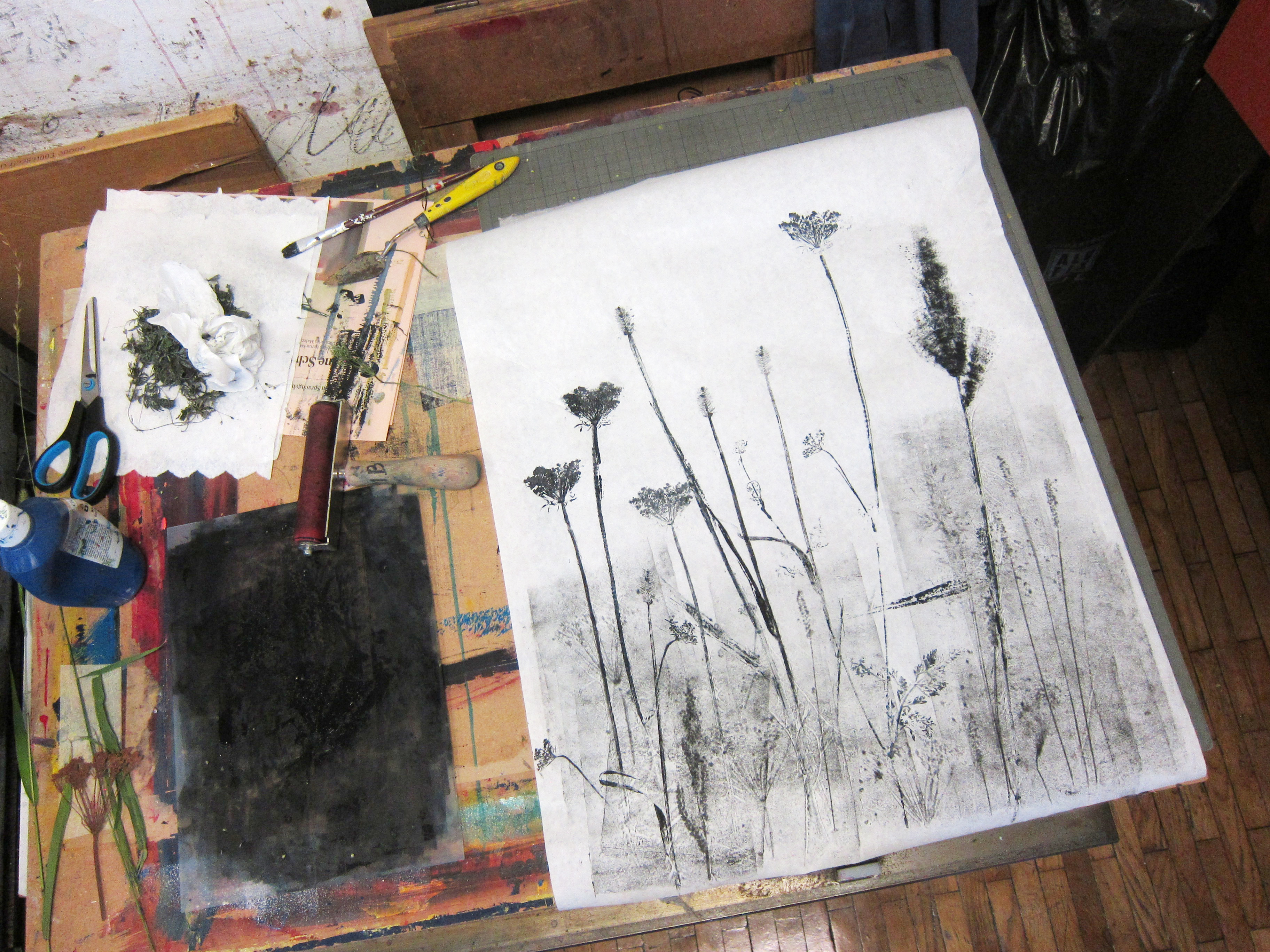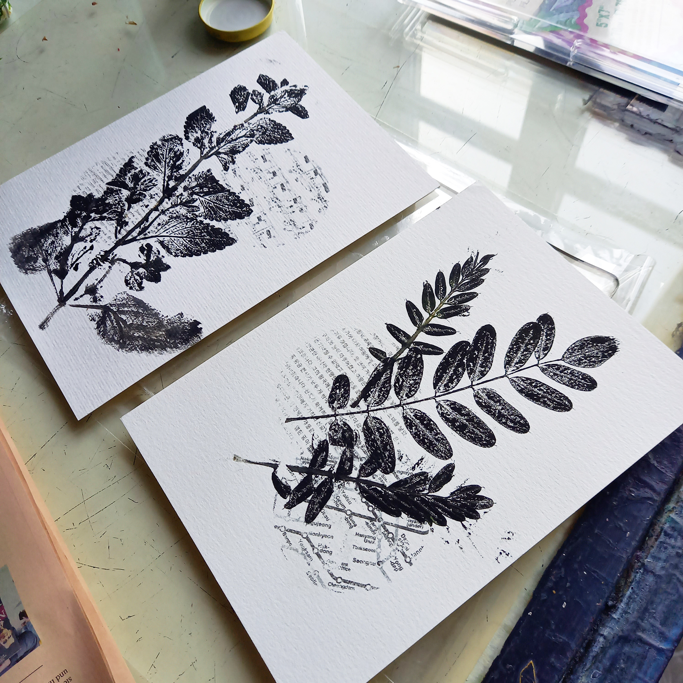 Ein altes Verfahren, bei dem organische Materialien – Blätter, Farne, Pflanzen – direkt als Druckformen eingesetzt werden. Die Naturobjekte werden eingefärbt und mithilfe von Walzen auf den Bildträger gedruckt; selbst feinste Strukturen lassen sich so detailgetreu wiedergeben. Die Technik wurde neben der künstlerischen Anwendung vor allem in der Botanik weiterentwickelt.